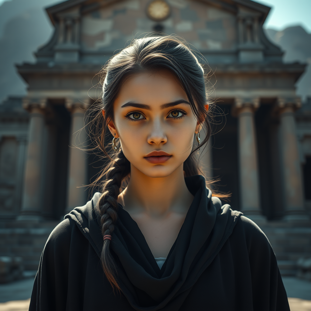 A young woman in dark robes stands in front of an ancient temple, her symmetrical eyes catching the dramatic lighting that casts intricate shadows. The scene captures a hyperrealistic portrayal, reflecting a highly detailed and complex composition that resembles a high-definition photography masterpiece. The sharp focus and physics-based rendering create an 8K-resolution image with every detail meticulously rendered. This digital art piece blends elements of CGI, 3D modeling, and hyperrealism to create a stunning illustration, free of imperfections such as low resolution or poor anatomy, ensuring a flawlessly proportioned and beautifully composed visual.