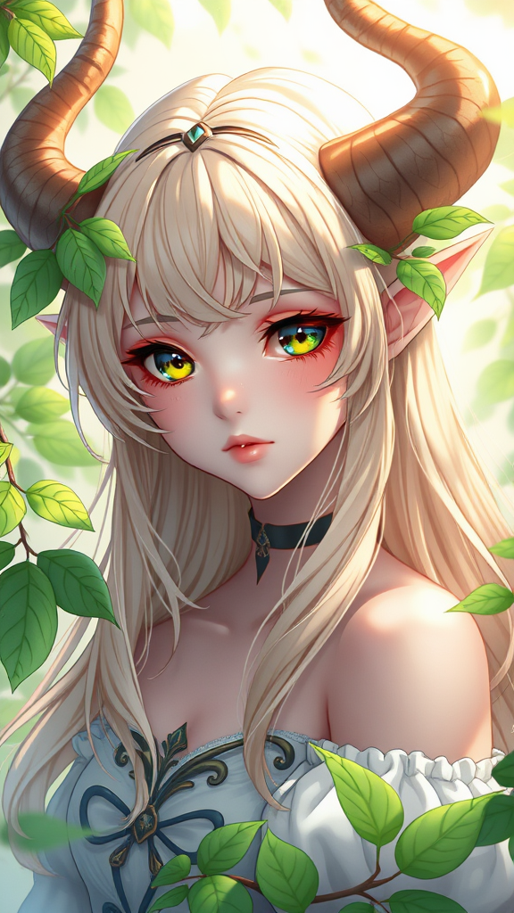 Blond-haired girl with elegant horns adorned with vibrant green leaves, surrounded by ethereal light, featuring detailed digital anime art style. Inspired by the enchanting works of Loish and Guweiz, seamlessly blending adorable aesthetics with the intricate fantasy of WLOP, creating a captivating elf girl with a bewitching presence. This character is infused with a hyperdetailed fantasy essence, bringing forth an anime-styled 3D illustration that captures both grace and mystique, perfect for fanart and showcased as a standout creation on ArtStation.