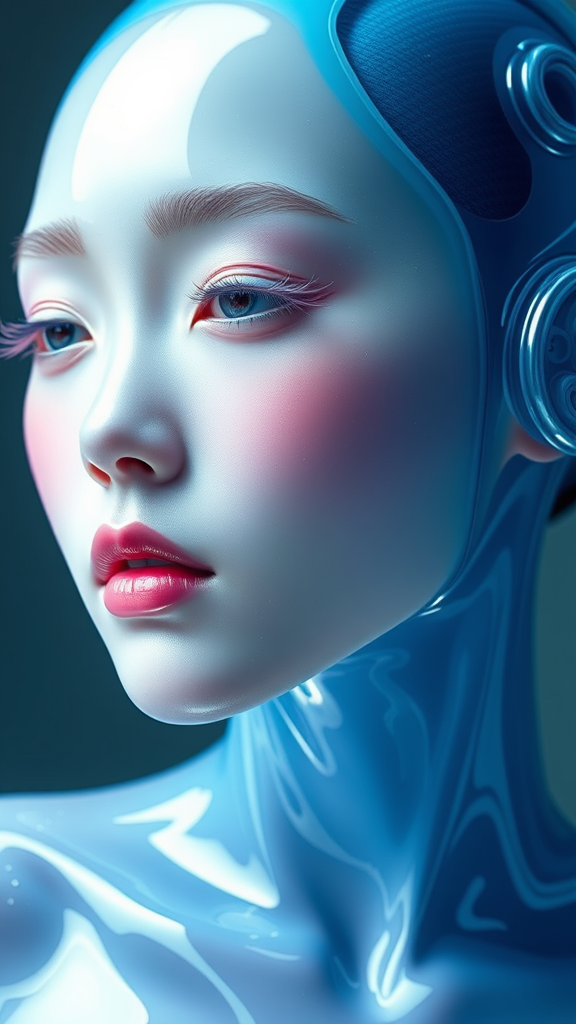 Three-quarters portrait of a cobalt-blue body with a soft pink face enveloped in glistening fluids, blending futuristic sci-fi and hyper-realistic portrait styles. Featuring Asian-inspired elements with a light palette of whites and soft pinks, the piece exhibits a shiny, glossy texture reminiscent of aurorapunk aesthetics. The photorealistic accuracy captures the essence of modern futurism, maintaining a raw, unfiltered style that underscores the elegance and surreal beauty of this vision.