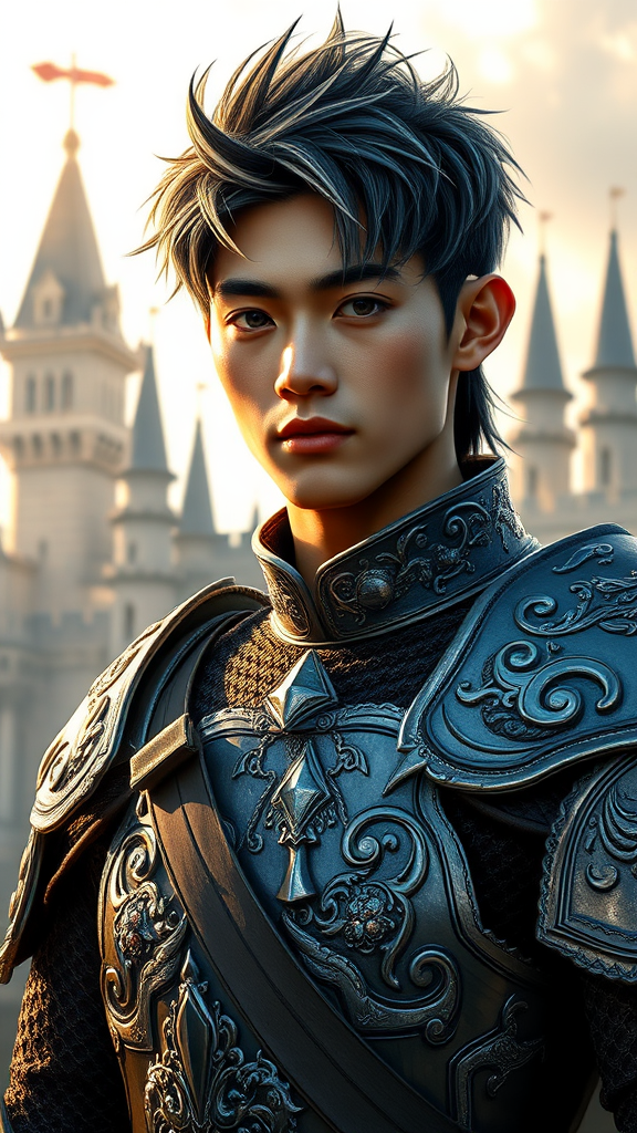 Medieval fantasy portrait of a strikingly handsome Asian male warrior, clad in intricately detailed armor, standing before a majestic fantasy castle. The bright morning light casts a dramatic glow from the side, illuminating his features. His hair, a striking blend of black and silver, frames a face with eyes that shimmer with electric intensity, hinting at a fierce and unpredictable nature.