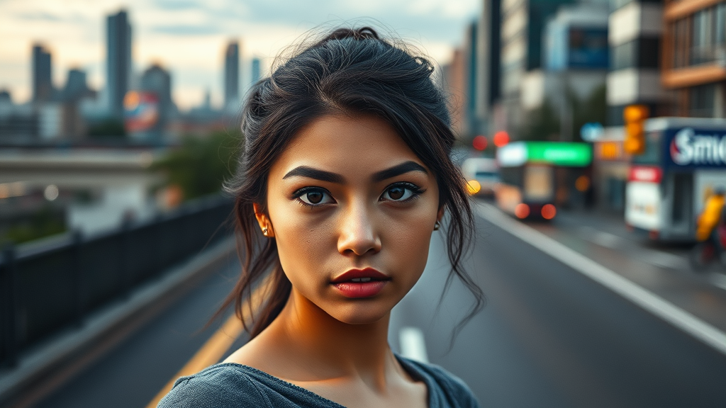A stunning, one-of-a-kind portrait of a young woman, standing alone, her face intricately detailed with striking features, set against the bustling backdrop of a vibrant cityscape, with the road stretching out behind her.