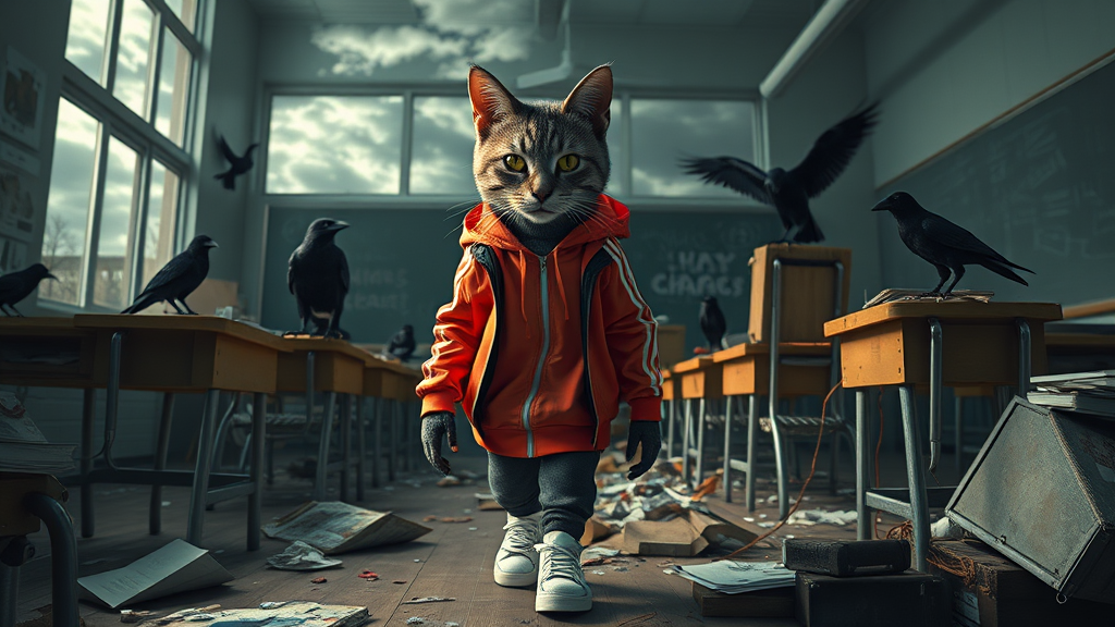 An ultra-realistic, anthropomorphic cybernetic cat exudes cuteness as it struts through a chaos-ridden classroom, its sleek form clad in a vibrant Adidas jacket and sneakers. Unsettling shadows flicker across the scene, with eerie crows perched ominously on damaged desks and upturned chairs. The room is steeped in a haunting atmosphere, with traces of horror hidden in the intricate details. Outside, a breathtaking sky shimmers in shades of gray and green, casting a surreal glow over the disarray. The composition adheres to the golden ratio, creating a mesmerizing balance between beauty and the creepiness of the setting. Framed in an ultrawide, hyper-detailed, and cinematic style, the scene is a hyper-maximalist fusion of fantasy and reality, where every element is intricately designed to enhance the ominous ambiance.