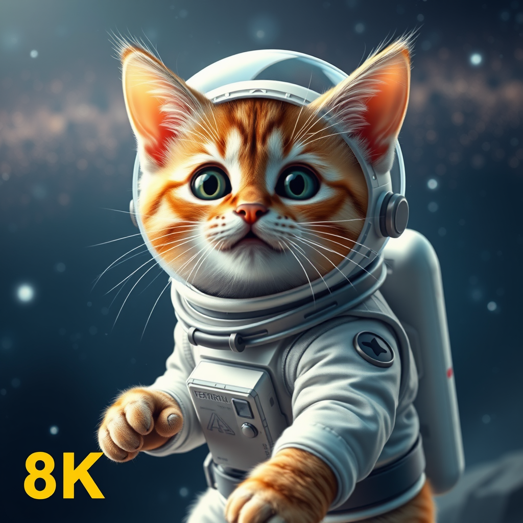 Realistic, adorable cat wearing an astronaut suit exploring the cosmos, ultra-high-definition, 8k quality, playful expression, galactic backdrop, twinkling stars in the distance.