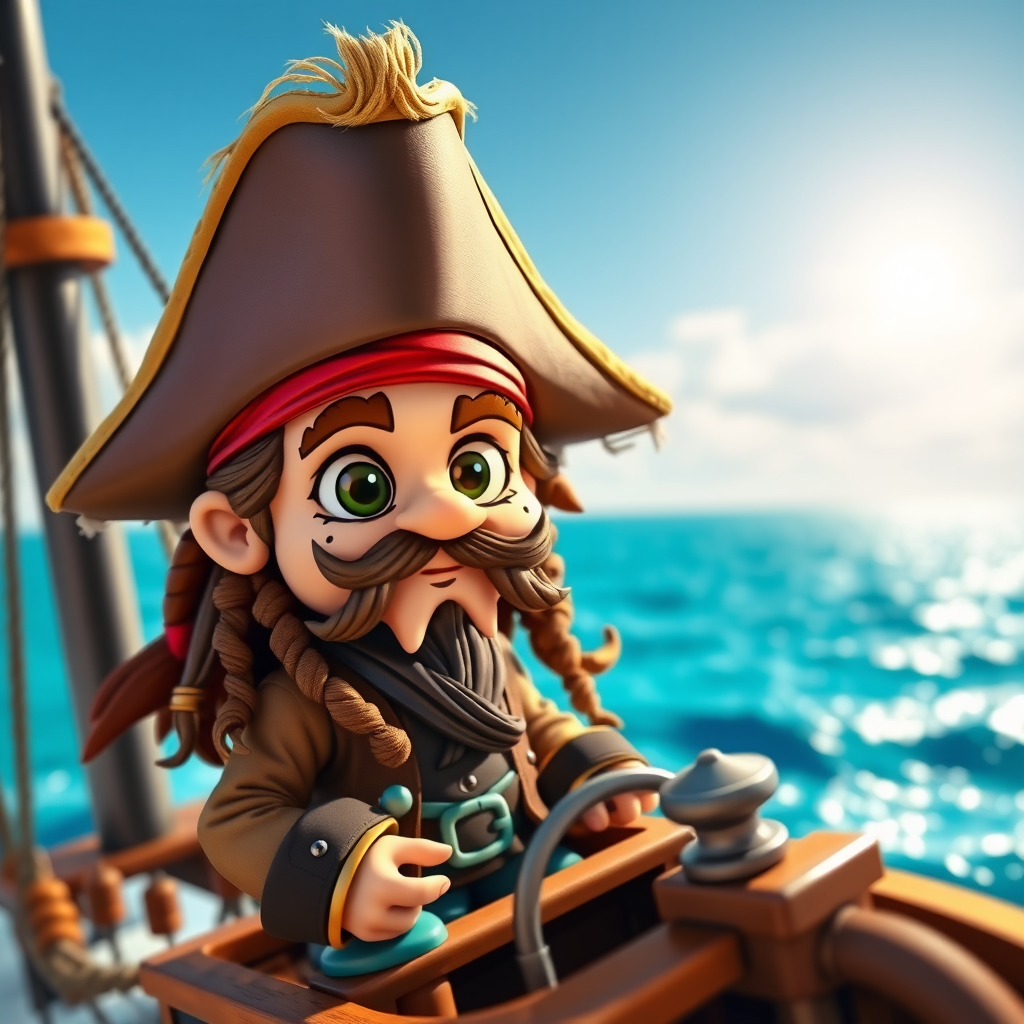 Miniature cartoon pirate captain inspired by Jack Sparrow, featuring exaggerated features and a playful expression, wearing a tattered tricorn hat, braided beard, and colorful pirate attire, sailing a tiny whimsical ship on a bright blue sea under a sunny sky.