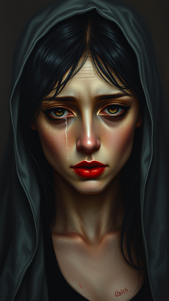 A realistic and epic portrayal of a woman, her face a portrait of deep sadness, tears tracing paths down her wet cheeks. Her expression is one of profound sorrow, with red and swollen eyes, furrowed eyebrows, and a red nose. Her mouth is slightly open, capturing a moment of silent despair. She has striking black hair and beautifully detailed eyes and ears, rendered in the dramatic and haunting style of Gothic art. Inspired by the works of the French painter Alexandre Cabanel, the oil painting features a veil and a subtle neckline, all bathed in the dim and moody lighting of an old gothic cathedral. The background, a shadowy representation of a cathedral's interior, enhances the overall atmosphere with its gloomy and sombre tones. The focus stays clear of neon hues, 3D elements, cartoonish features, or anime styles, ensuring high resolution with excellent anatomy and lighting. The character's physical attributes remain true to a realistic depiction, avoiding any exaggerated or deformed features.