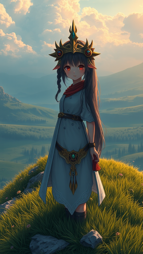 A stunning paladin girl stands alone on a hill, perfectly centered with a detailed and gorgeous anime-style face. The scene is a breathtaking key visual with intricate, highly detailed artistry, presented in vibrant, panoramic, and cinematic fashion reminiscent of Carne Griffiths and Conrad Roset. The overall composition provides an 8k ghibli-esque aura, capturing the essence of both awe and serenity in its execution.