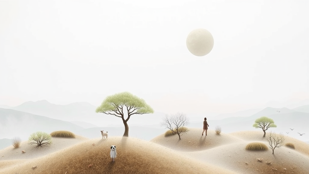 Surreal elegance unfolds in minimalist form, with dreamlike landscapes and whimsical elements juxtaposed against a serene backdrop, creating an imaginative world where simplicity and fantasy merge effortlessly.