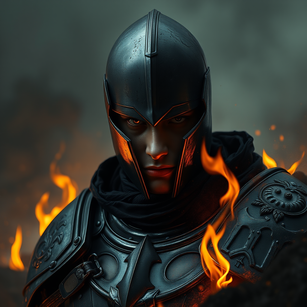 A half-body portrait of a dark knight emerging from the ashes, embodying villainy with an intense gaze. The scene is engulfed in subtle flames, casting a glow that highlights the knight's intricate armor details in muted tones. The focus is sharp, capturing the realism and emotional depth in a photograph-like digital painting. Soft lighting enhances the texture and nuance of the scene, rendered in 8k with extreme detail. The background is abstract and smoky, suggesting a world in ruins, while the knight's expression conveys a blend of determination and melancholy. The composition is clean, avoiding clutter or confusion, with an emphasis on the knight's enigmatic presence and the burning environment around him, all crafted into a seamless, evocative narrative.