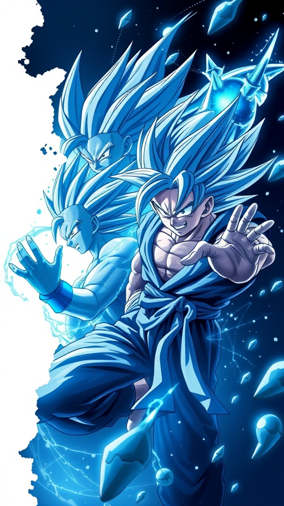 Dragon Ball anime wall art picture featuring dynamic Dragon Ball characters, rendered in dark azure and silver tones, inspired by the style of Yanjun Cheng. This piece captures energetic, dynamic compositions with a realistic portrayal of light and shadow. The artwork features a light silver and light blue palette with a cut/ripped aesthetic and enhanced rendering to emphasize depth and dimension. Aspect ratio is set to 9:16, providing a cinematic vertical view that immerses the viewer into a vivid Dragon Ball universe with a touch of creative flair and innovation.