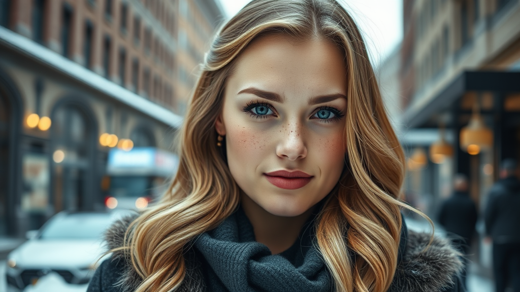 Professional portrait photograph of a woman resembling Gal Gadot, with long wavy blonde hair and delicate freckles, beautifully symmetrical features, sporting cute natural makeup. She is dressed in stylish winter clothing and set against a stunning modern urban upscale background. The image is ultra-realistic, resembling concept art with an elegant and intricate design, captured in sharp focus with a depth of field at f/1.8, using an 85mm lens. The scene includes volumetric fog, giving it a cinematic feel, and is suitable for trending on social media platforms like Instagram and Tumblr, presented in HDR 4k, 8k resolution. The composition is a medium shot, emphasizing her grace and presence.