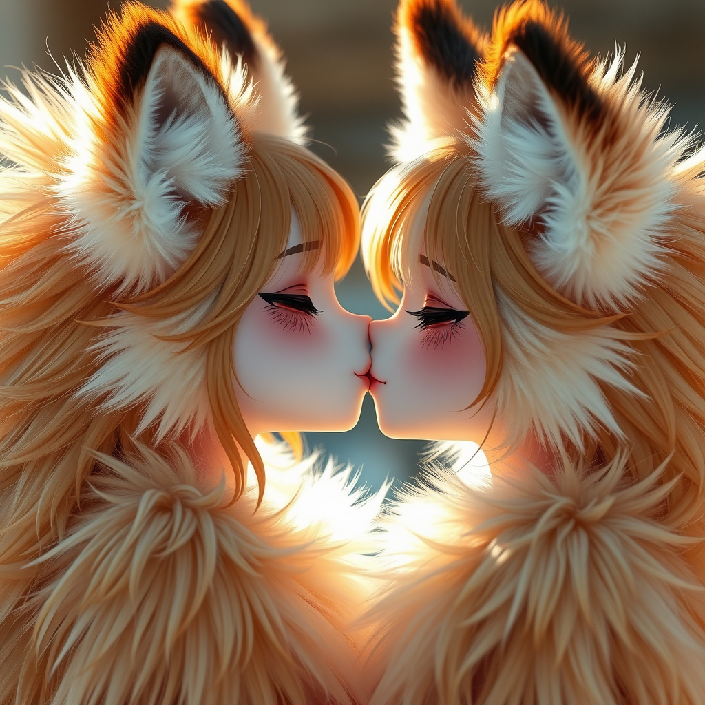 Fluffy nine-tailed fox girl inspired by the styles of Wlop and Guweiz, ultra-realistic photography with professional 8k resolution, featuring soft and natural lighting. She leans in for a kiss with an expression of playful anticipation, her eyes sparkling with warmth. The scene captures a moment imbued with gentle emotion, as the soft glow highlights the texture of her fur and the delicate details of her features.