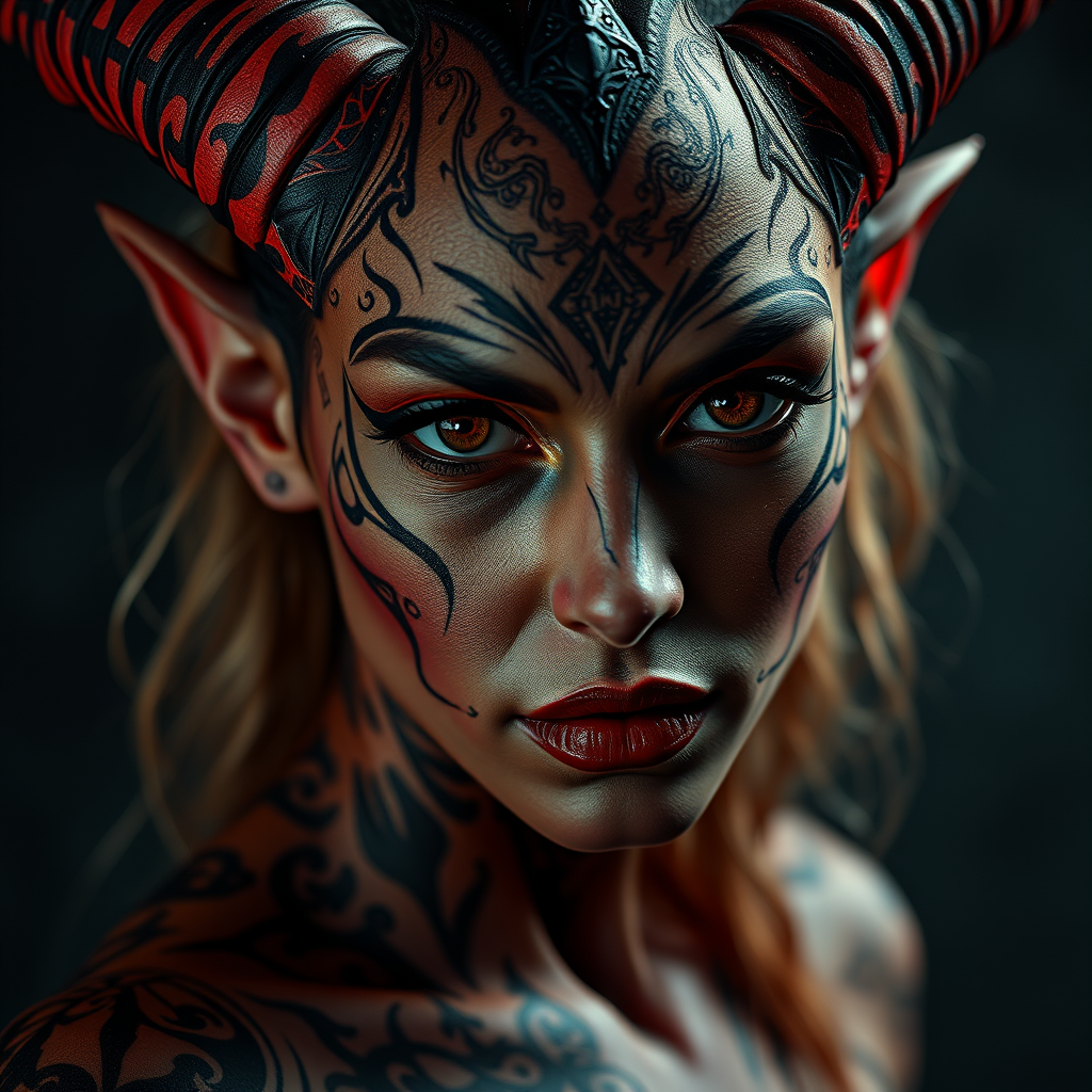 A hyper-realistic full body female demon with an enchanting aura, manifesting as a breathtaking woman to captivate unsuspecting men. Her skin is adorned with intricate witchcraft symbols, artfully tattooed with mesmerizing precision. Her eyes, deep and alluring, reflect a gaze filled with seductive allure as she faces the camera. Captured with the exceptional clarity of a Hasselblad H4D 200MS Digital Camera and the exquisite sharpness of a Mitakon Speedmaster 65mm f/1.4 XCD lens, this image portrays an air of mystique and temptation. Her ethereal beauty, devoid of traditional horns, captivates the senses, evoking a sense of forbidden enchantment amidst a dramatic 1:2 aspect ratio setting.