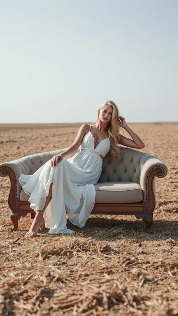 A slender woman, reminiscent of Lalisa Manobal, lounges elegantly on a couch situated in a vast, open field. She wears a flowing white boho dress, her long, blonde hair cascading down her shoulders. Her presence is both alluring and ethereal, embodying a flowerpunk aesthetic, with a touch of feral languor. The barren landscape stretches out around her, evoking a sense of desolation. Her appearance draws parallels to the enigmatic allure of Imogen Poots, with her delicate frame and captivating demeanor set against the stark simplicity of the surrounding environment.