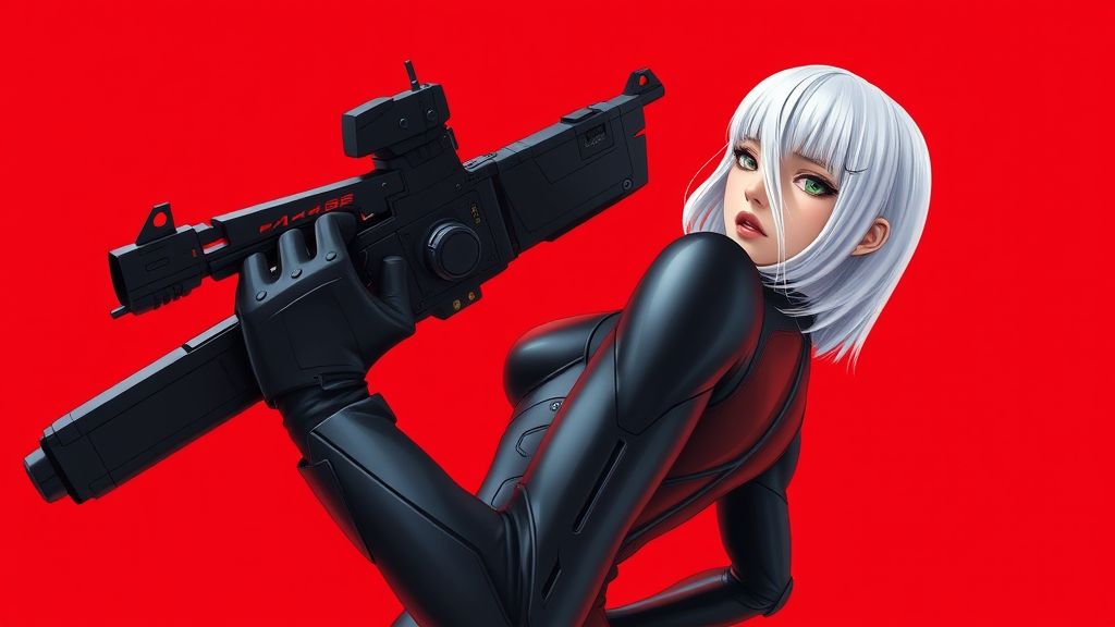 A stunning young woman with striking white hair glances sideways, her captivating eyes full of intensity. She dons a sleek black mecha suit that clings to her form, embodying a minimalist yet powerful design. In her hand, she grips a sleek, futuristic gun, the embodiment of elegance and strength. Her pose emphasizes her raised hip, adding a dynamic flair. The backdrop is a simple yet vibrant bright red, making her presence even more commanding. Captured through an artistic fisheye lens, the scene is a masterpiece of top quality and official art, blending beauty and aesthetics with animation-like fluidity.