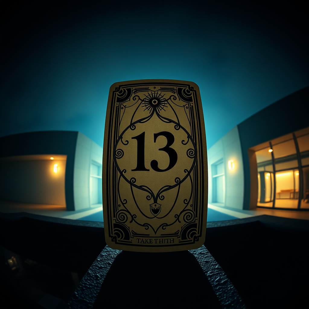 Hyper-realistic fisheye exterior photo capturing a gothic-style tarot card labeled "13th," positioned to overlook a dramatic scene. The scene is bathed in cinematic and indirect lighting, creating an atmospheric effect reminiscent of an AD magazine editorial. Influences of Tim Burton's whimsical darkness blend with the minimalist elegance akin to Eames and Mies van der Rohe, offering a unique juxtaposition of fantasy and modern architecture. Moody shadows and contrast enhance the intricate details of the card and surrounding environment.