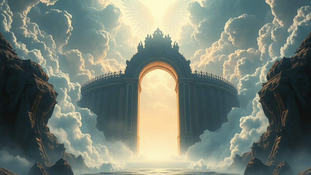 A breathtaking cinematic shot of the ethereal gates to heaven, intricately detailed and rendered in stunning 8k resolution with an atmospheric feel. Styled in the manner of Ivan Aivazovsky, Peter Mohrbacher, and Greg Rutkowski, this artwork features dynamic volumetric light effects and expansive broad lighting, reminiscent of a masterful oil painting. The scene blends elements of fantasy art and sci-fi realism, capturing a surreal essence as if brought to life through Unreal Engine. Ideal for premium prints, this visual masterpiece transcends reality while maintaining a touch of the fantastical.