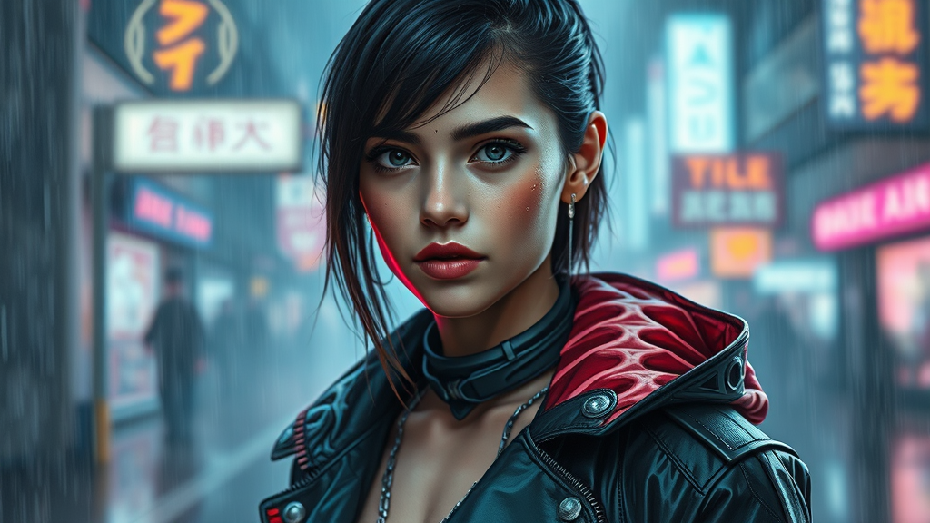 A futuristic portrait of a European young woman in a stormy rain setting, wearing a sleek, sci-fi movie-inspired jacket and royal attire, designed by the likes of Ismail Inceoglu, Dragan Bibin, Hans Thoma, Greg Rutkowski, and Alexandros Pyromallis. Featuring a flawless face with sharp features, fine details, and realistic shading, the image merges cyberpunk and neotokyo aesthetics with synthwave influences. Set against a low-emission-neon backdrop resembling a Blade Runner movie scene, the portrait is characterized by its vibrant futuristic elements. The composition avoids common pitfalls such as poor quality, distortions, or unnatural features, focusing instead on a seamless depiction with balanced anatomy and realistic proportions.