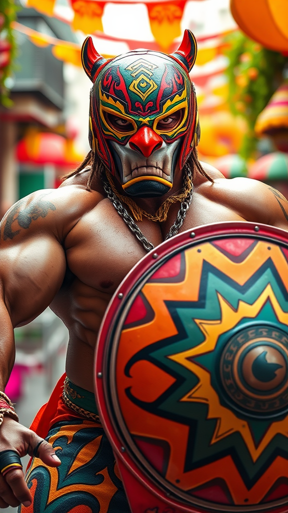 Capture El Tigre Braum in a hyper-realistic photograph set amidst a vibrant and colorful Mexican-inspired environment. Showcase his towering and muscular physique, intricate luchador mask, and signature shield with advanced lighting techniques and dynamic posing. Highlight the details of his fierce and determined expression to convey a sense of strength and agility. Utilize a bright and bold color palette with pops of orange and yellow to create a photograph that captures the essence of El Tigre Braum's lively and energetic nature, incorporating traditional Mexican motifs and a bustling street festival backdrop to emphasize cultural richness.