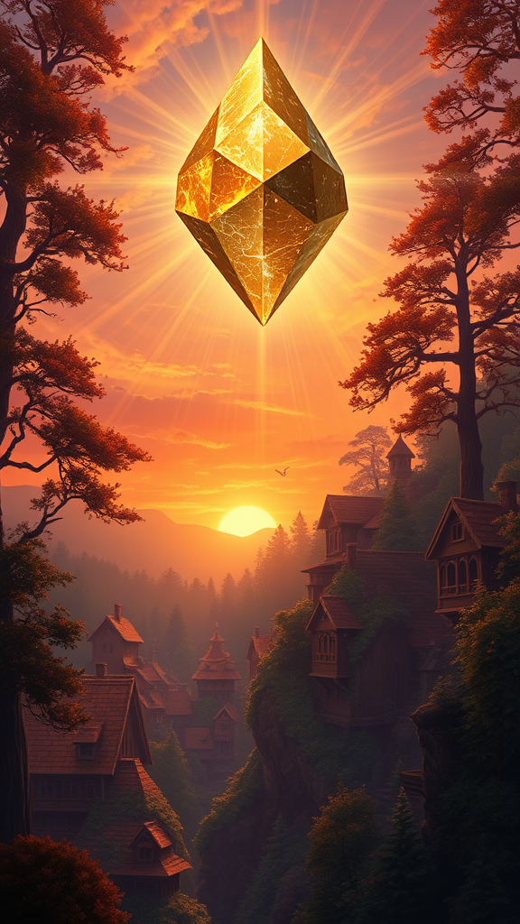 A breathtaking digital painting of a Magic The Gathering inspired scene, showcasing a sunset over an enchanting city nestled within towering trees. The city features wooden buildings with intricate fantasy and medieval designs. Suspended high above, an enormous luminous crystal floats, casting brilliant beams of light that dance across the city and bathe the lush forest in a warm, golden glow. The rich color palette captures the harmonious blend of nature and magic, with hues of amber, crimson, and emerald. Subtle magical creatures and ethereal flora add an air of mystique to the vibrant, serene landscape.