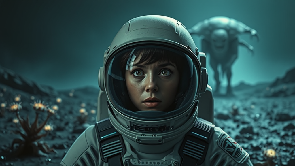 A terrified astronaut peers through her helmet, eyes wide with fear as an enigmatic creature lurks behind her on a desolate alien landscape. The scene unfolds on a shadowy, moisture-laden world, where the oppressive darkness is punctuated only by the faint luminescence of bizarre, alien flora. The air is heavy with tension, and an eerie silence permeates the surroundings, amplifying the astronaut's growing dread as the alien presence closes in.