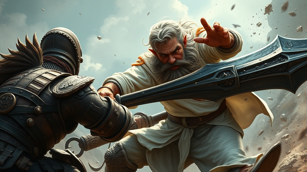 A full male halfling body engaged in a dynamic battle against an adversary wielding a massive weapon, inspired by Pipin from Dragonlance. The scene captures a clever and agile fighter, focusing on detailed facial expressions and intense eyes. The environment is photorealistic with sharp, realistic details, showcasing a masterpiece in 8k quality. The artwork blends the styles of Jeremy Mann, Sandra Chevrier, and Maciej Kuciara, emphasizing real shadows and 3D elements. The character, with more than two arms and an intricate beard, wears a white robe and pants. The scene avoids cartoonish elements and maintains a focus on realism, omitting additional figures such as children or women, and steering clear of any NSFW or overtly fantastical elements like horns.