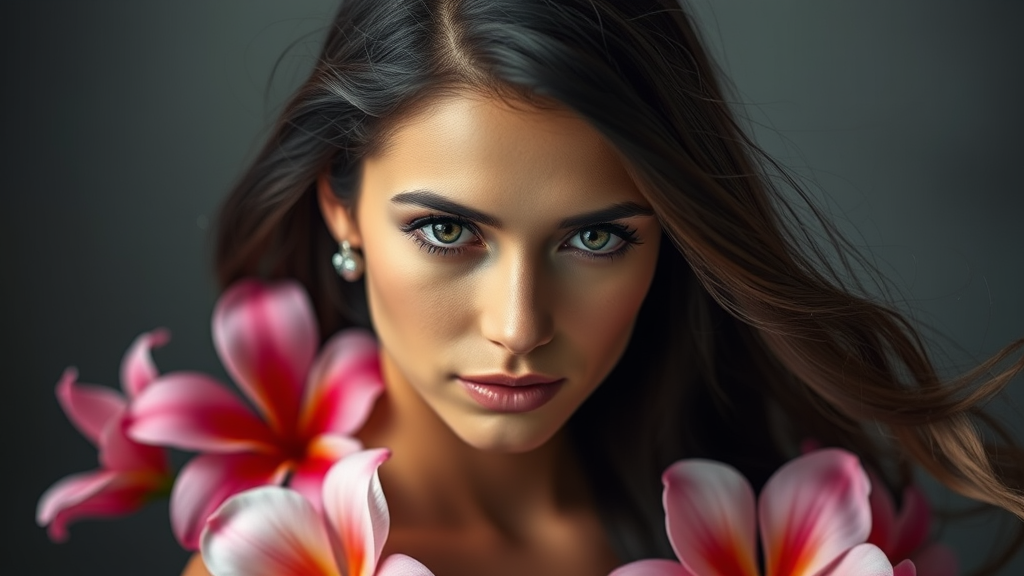 Inspired by the initial prompt, here is a refined version: portrait, striking woman, dark hair, dynamic composition, subtle elegance, vibrant flowers, high-resolution, focused, serene expression, natural beauty, detailed features, soft lighting, classic artistry, harmonious colors, refined composition, integrated elements, sophisticated style, elegant form, balanced anatomy, realistic depiction, flowing contours, graceful presence, thoughtful design, seamless integration, cohesive elements, timeless appeal, captivating subject.
