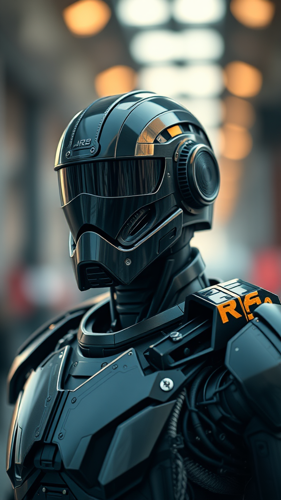 portrait of a guard android, robotic, mechanical, black reflective armour, metal plating, 80mm, f/1.8, dof, bokeh, depth of field