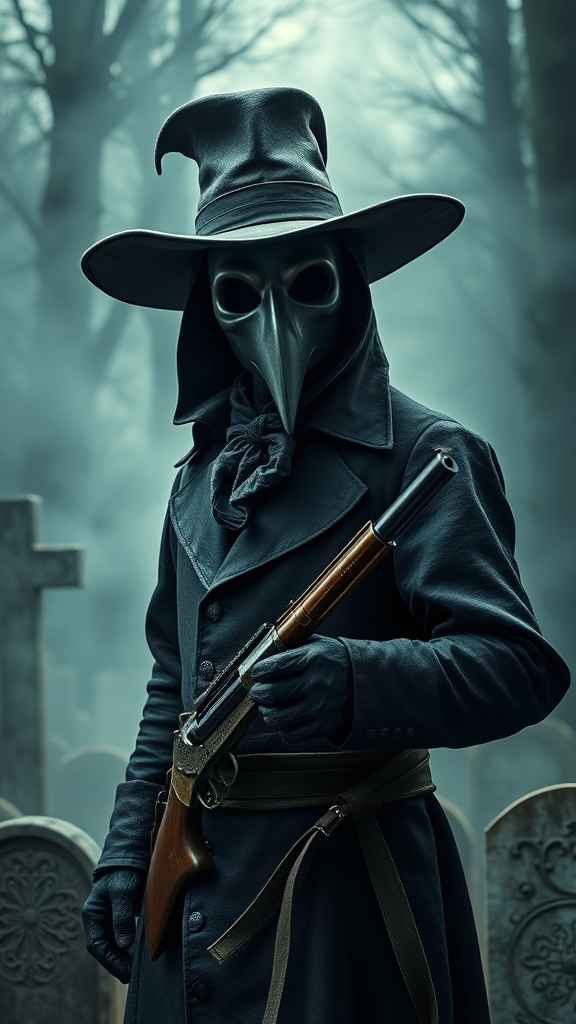A 17th-century plague doctor stands in a mysterious, fog-laden graveyard, donning the iconic wide-brimmed hat, elongated mask, and dark leather attire. An anachronistic 6-shooter revolver rests confidently at their side. The scene is illuminated with cinematic lighting, revealing intricate details of the medieval surroundings. The high-definition render captures the intricate textures of aged gravestones and the swirling fog, creating a sharp focus on the doctor's enigmatic presence. Executed in a hyper-realistic style, the composition immerses viewers into this epic fantasy tableau, blending historical imagery with imaginative elements in an 8k photorealistic masterpiece.
