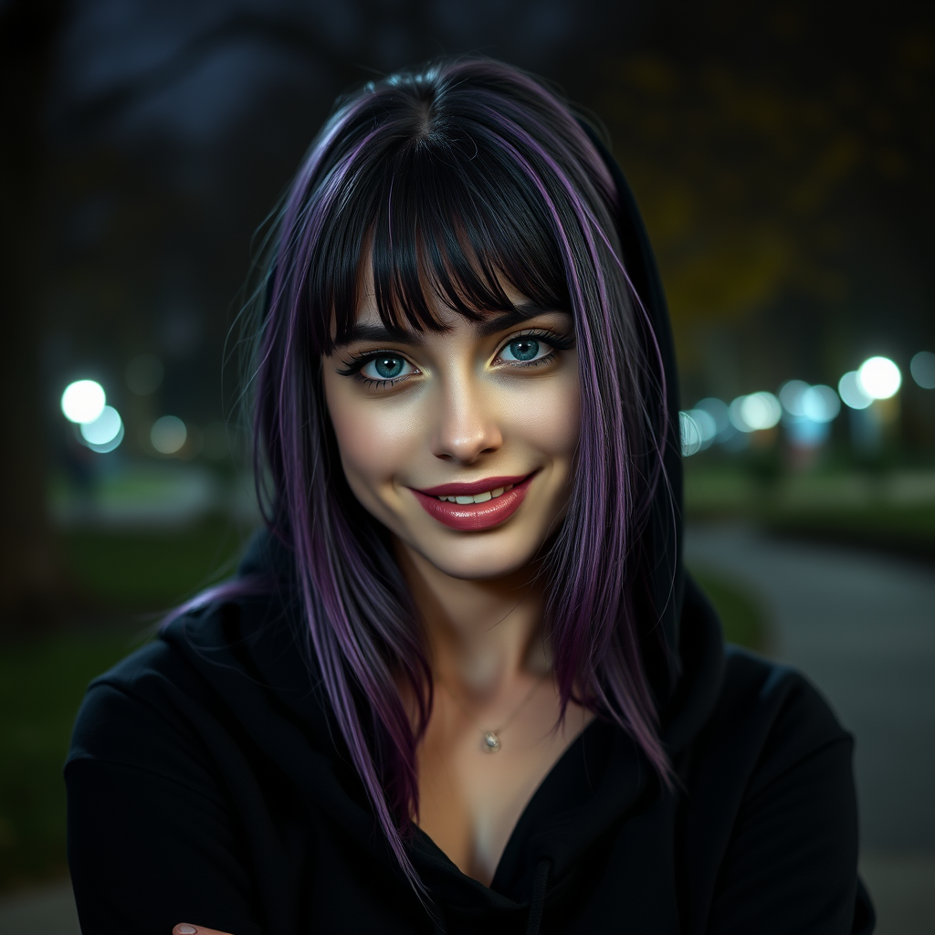 women, black hoodie, sfw, arm tattoo, long hair, bangs, small breasts, captivating green eyes, purple hair, detailed park background, portrait style, smiling with a seductive glance, set at night with dim lighting, 8k ultra-high-definition, realistic feel, captured with a Nikon z9 using raytracing, focus on the face, sharp and clear imagery, unique artistic touch, without distortion or text overlays, clear of digital artifacts, singular perspective, elegant posture, refined.