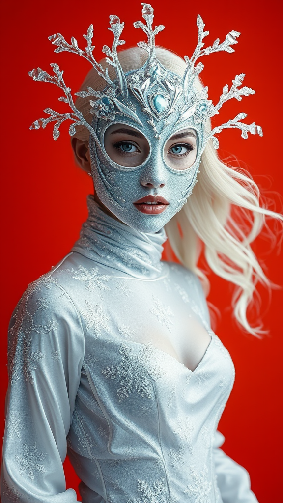 Create a hyper-realistic portrait in HD, showcasing a woman adorned in a full mask sculpted from glittering ice and frost. The mask is smooth and translucent, featuring intricate crystal formations that branch asymmetrically around the edges, resembling fractal patterns of frozen water. She wears a flowing gown of shimmering silver and white silk, intricately woven with delicate snowflake designs, the fabric sparkling as if brushed by frost. The gown seems to move gently as if caught in an eternal, soft winter breeze, evoking an ethereal sense of motion. Her hair cascades in waves of silken white, gleaming faintly and complementing her pale, porcelain-like complexion which radiates a subtle, frost-nipped glow. The backdrop is a vivid orange-red, providing a surreal contrast to the icy elements of her attire and enhancing her frozen elegance. Soft, cool lighting highlights the translucent features of her mask and the icy sparkle of her gown, creating an aura of otherworldly magic and pristine winter beauty.