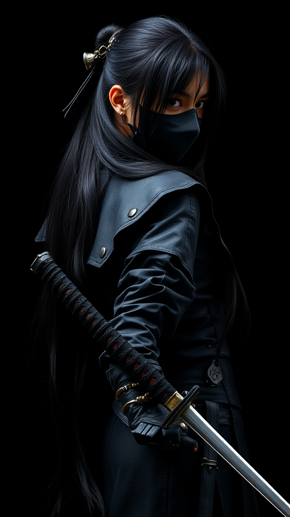 A female shinobi glances back, captured from behind, her mask partially revealing piercing eyes. Long, flowing black hair cascades down her back, contrasting against her dark padded outfit adorned with intricate leather and metallic accessories. She grips a glistening katana, its blade reflecting subtle hints of red and black, mirroring her attire's dark and muted tones. The scene is set against a black backdrop, with minimal, strategic lighting emphasizing the hyperrealistic texture of her ensemble. Her poised and stealthy stance exudes power and mystery, enveloped in an atmosphere of high contrast.