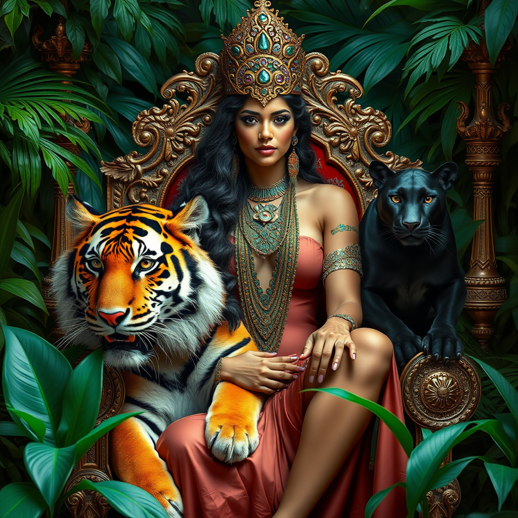 Stunning π goddess with a majestic tiger and sleek panther, intricate face details, seated gracefully on an ornate jungle throne, surrounded by a verdant and lush environment, illuminated by cinematic lighting, embodying junglecore aesthetics, character portrait inspired by Annie Leibovitz, subtly enhanced by Pratik Naik, exuding an air of mystery and strength amidst the vibrant foliage.