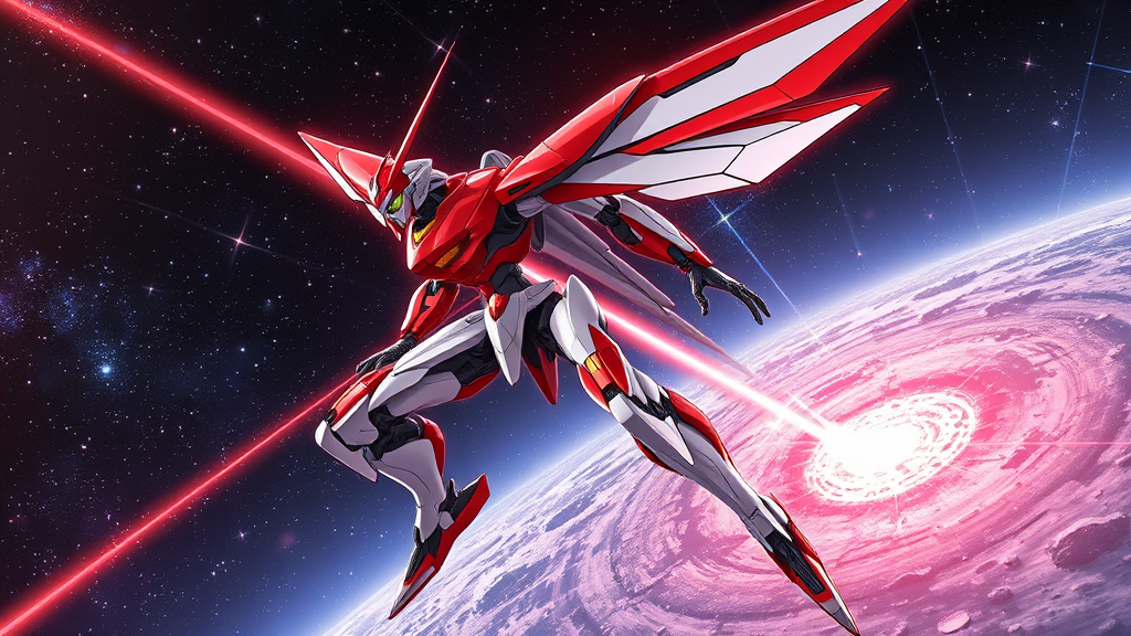 A hyper-detailed depiction of a sleek, futuristic mech with a slender, agile form, poised dynamically in a battle-ready stance. This glossy red and white mechanized figure features an intricate, insectoid-inspired design, with sophisticated sci-fi wings that add an ethereal quality. Drawing inspiration from the artistic styles of Tsutomu Nihei and Akira, the scene is set against the awe-inspiring backdrop of a luminous quasar, with the vastness of space adorned by glittering stars and powerful stellar phenomena. The scene is electrified by vivid plasma beams and an intense plasma blast wave, casting complex lighting effects across the mech's surface. Rendered in ultra-high definition 8k graphics, this portrayal achieves a striking blend of anime artistry and hyper-realistic detail, capturing the drama and immensity of the cosmic setting.