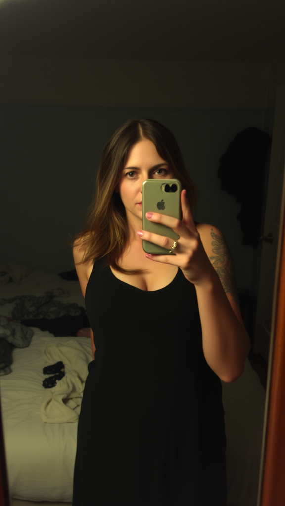 In a dimly lit room, a woman stands in front of a speckled mirror, holding up an outdated smartphone to take a selfie. The image appears grainy, with a slight blur that lends a dreamlike quality to her figure. Shadows drape softly across her face, partially obscuring her features. Around her, the room is in disarray, with clothes tossed haphazardly over the unmade bed, adding to the sense of lived-in chaos. Her expression is one of casual focus, as the phone struggles to refine the moment into clarity, creating an unrefined, candid snapshot. Smudges and fingerprints on the mirror surface contribute to the genuine, everyday essence of the scene.