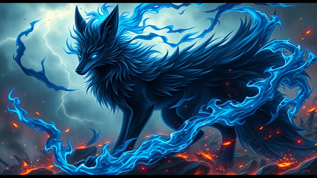 Majestic dark fox enveloped in swirling dark blue flames of energy, anime style, 8K resolution, sorcerer humanoid male prince of shadows reigning on the battlefield, radiant blue infernal flames and sparks illuminate the backdrop, apocalyptic scene, vibrant and intricate, elegant digital illustration, scenic, hyper-detailed, thunderstorm raging overhead.