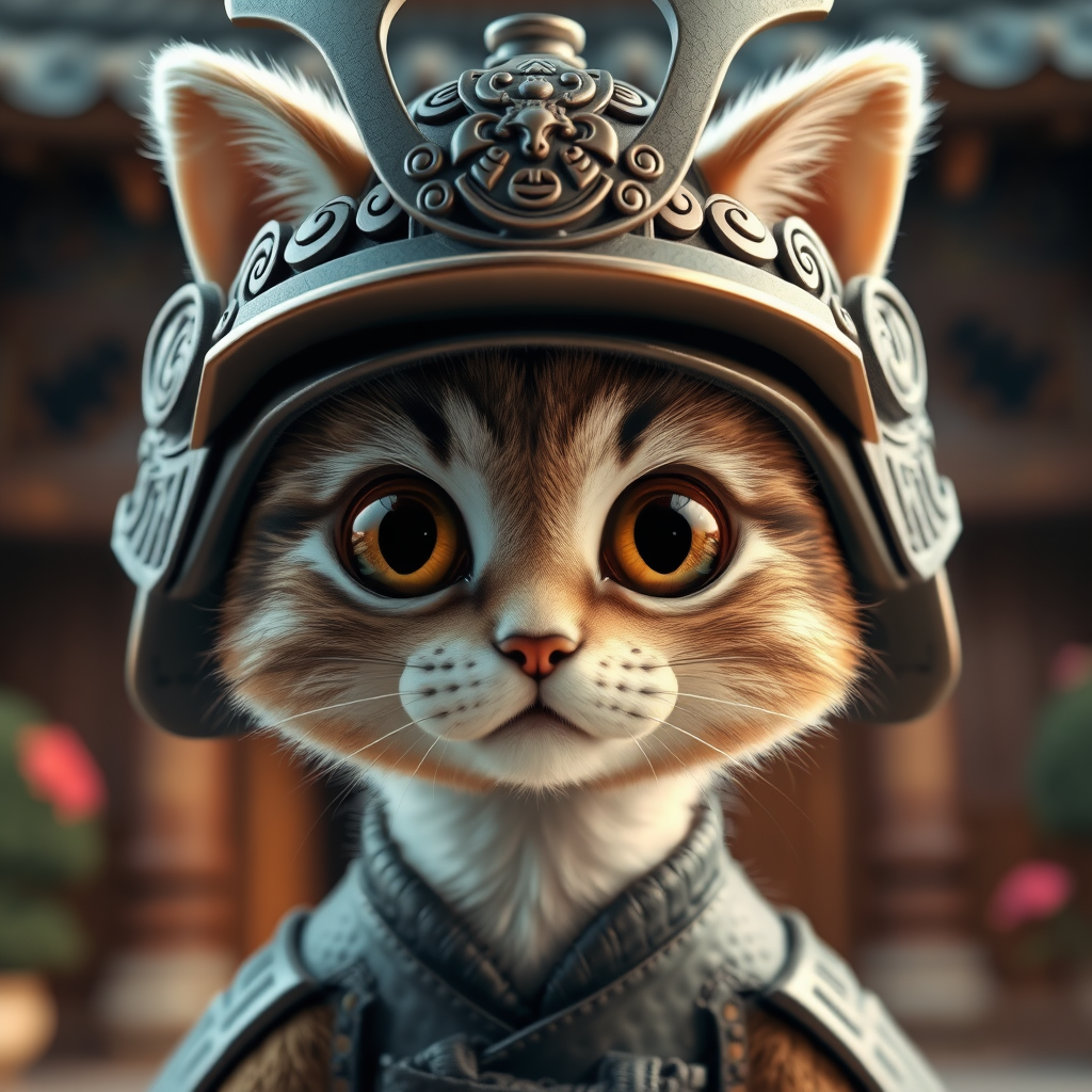 A detailed close-up of an adorable cat wearing an intricately designed helmet, showcasing its wide, curious eyes. The cat's fur is rendered in a soft, realistic texture, while the helmet features ornate samurai engravings and a subtle metallic sheen. The background is a blurred, traditional Japanese garden, highlighting the cat's noble stance. The overall scene is a charming blend of realism and whimsy, bringing the furry samurai character to life in vivid, 3D detail.