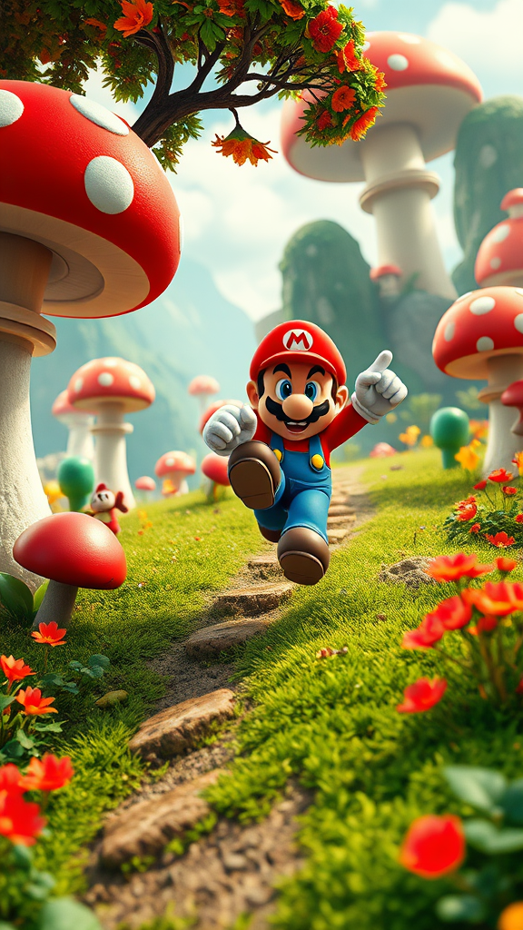 Super Mario dashing through the vibrant Mushroom Kingdom, lush scenery in the backdrop, 32k resolution, closeup detail, popular on poltcount 3D, video game aesthetics with modern flair, ultra-realistic textures and colors, cinematic angle -- energetic and dynamic, vertical 2:3 aspect ratio, stylized richness and depth, capturing the essence of an iconic adventure.