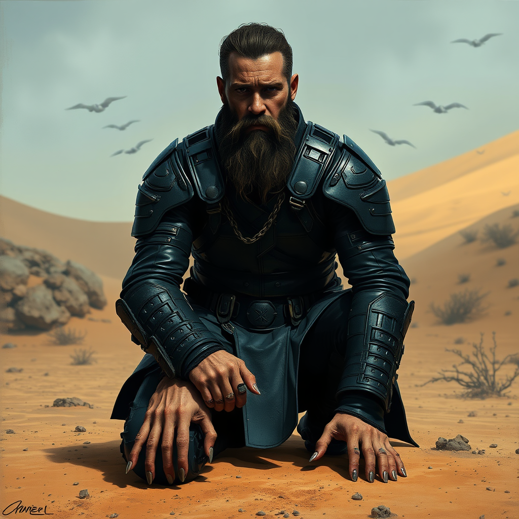 A full-length portrait of a bearded man wearing sleek sci-fi leather armor, kneeling in a desert environment. The setting is gothic, with a highly detailed and expressive face, all captured in cinematic lighting. The scene is depicted in digital art with character design and concept art elements. There's a hint of surrealism with subtle errors like missing fingers and extra digits, contributing to an otherworldly atmosphere. The artwork includes text and exhibits low-resolution qualities like JPEG artifacts, along with poor anatomy like disfigured hands and feet. Elements such as out-of-frame cropping, tiling issues, and artistic imperfections like blurry details, watermarks, and grotesque mutations add to the piece's eerie and unsettling appeal, combining intrigue with a sense of the uncanny.