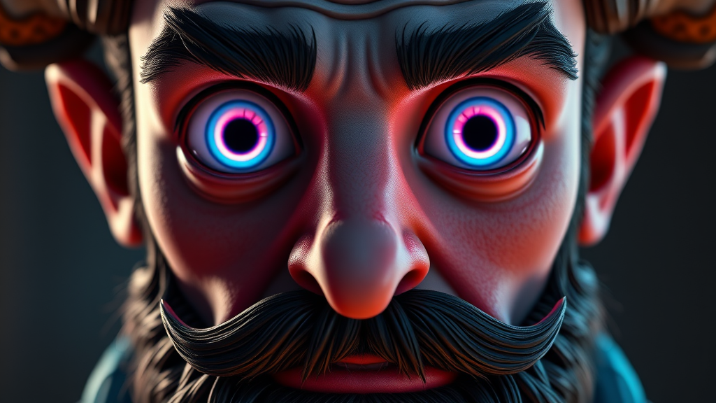 A detailed character portrait of a man with horns and a beard, crafted by a senior character artist and polycount contest winner, rendered in Unreal Engine 5. The character features bright, clear, neon Pixar-like eyes, capturing an aura of playful curiosity akin to playground adventures by Nomeradona. The eyes are large, circular, and highly reflective, offering a balance of Pixar's whimsical charm and Unreal Engine's cinematic smoothness. The portrait is an abstract yet intricate piece, leaning into a cartoonish, animated toy aesthetic. The figure may appear slightly abstract and surreal, with elements like extra limbs or exaggerated features, resulting in a playful, toy-like disfigurement. The close-up frame includes a touch of weird colors and a hint of blurriness, reminiscent of low-resolution, low-quality art, while maintaining a sense of digital craftsmanship through cgi elements. Despite imperfections such as bad anatomy or poorly drawn segments, the piece remains a uniquely stylized composition, blending elements of animation with surreal digital art, evoking a sense of colorful mischief and creativity.