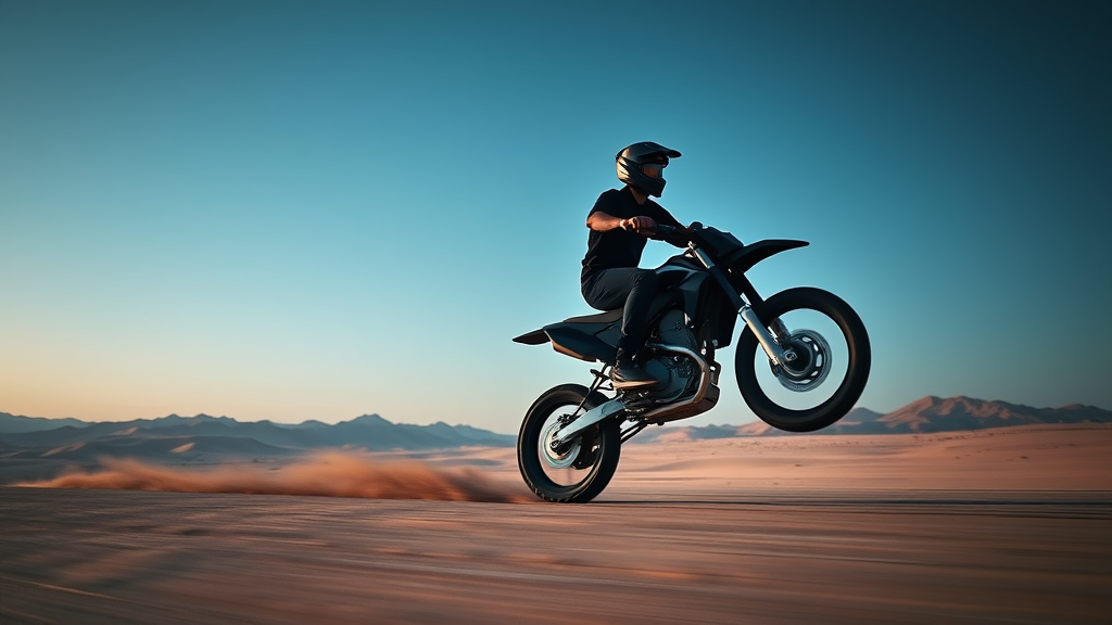 A young man riding an electric dirt bike across the desert in sleek black attire, astride an expensive carbon-fiber, futuristic battery-powered motorbike. Captured in a scenic wide landscape shot, with a low angle to emphasize the dynamic composition. The scene is rich with motion as the bike performs a high-speed wheelie, enhanced by subtle motion blur. Delivered in 8k UHD, the atmosphere is moody with professional color grading, set against a striking dark blue sky. The lighting is atmospheric, employing a polarizing filter for added depth and contrast. Elements like vignetting and combustion engines are absent, ensuring a clean and engaging visual. The composition avoids unrealistic anatomy and distortions, maintaining a polished, contemporary modernist photography style.