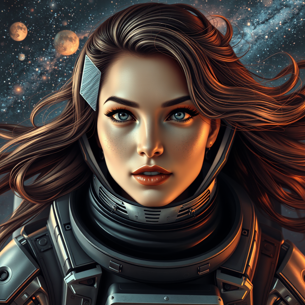 A striking portrait of a woman in a space suit, featuring retro-futuristic armor with intricate detailing. Her hair flows like the Milky Way, merging with the cosmos around her. The scene is captured in hyperrealistic art with dynamic lighting, reminiscent of a fantastical space experience. The artwork conveys an official and polished look, overlayed with subtle elements of vintage sci-fi charm. While maintaining a sense of authenticity, the piece playfully incorporates abstract imperfections, with hints of low-resolution textures and digital artifacts, evoking a sense of nostalgic flaw. Her form embodies a surreal quality, weaving an imaginative narrative, despite the occasional extra or missing limbs and digits typical of surreal art. This fusion of polished artistry and whimsical distortion creates an evocative and mesmerizing visual story.