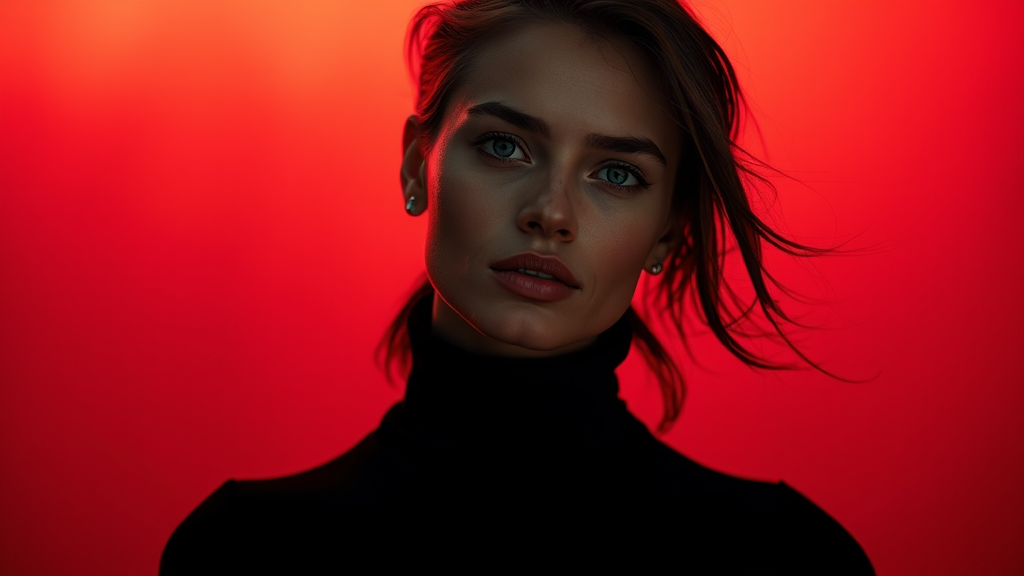 Front view upper body of a professional model with pronounced Greek dark facial features and distinctive heterochromia—one blue eye and one brown. Captured with a Hasselblad X2D 100c using an XCD 90mm f/2.5 lens, featuring a cinematic red color grading enhanced by the warmth of the golden hour. The composition is avant-garde, with the model's head tilted, offering a profound gaze directly into the camera. Their stance is elongated, wearing a flowing black turtleneck. Lighting is meticulously arranged with a professional main Fresnel light at a 60-degree angle and silky diffusion, complemented by a rim light with a CTO gel at 75 degrees. The backdrop transitions from burnt umber to ruby red, creating a dramatic silhouette. The atmosphere is ethereal, enhanced by a haze machine, feathered shadows, and manipulation of contrast curves. Selective dodge and burn techniques refine the imagery, with a grain texture overlay. Color temperature shifts from 5500K to 3200K, achieving ultra-sharp details in a hyper-realistic style inspired by Paolo Roversi's lighting techniques. The image is captured in 16K, offering rich detail and a personalized touch—style raw with an unmistakable artistic flair.