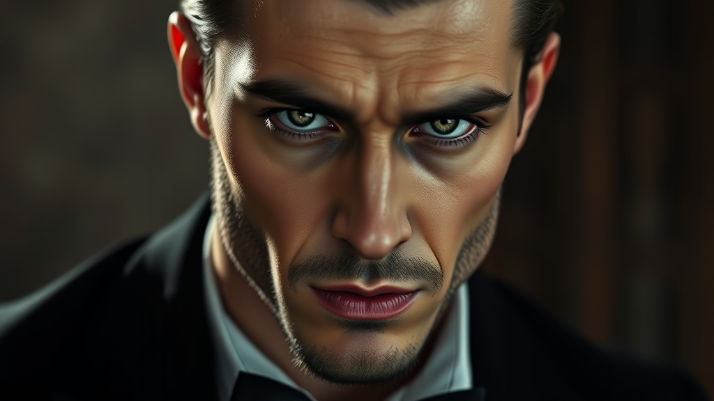 A portrait of an elegant, strikingly handsome dark bohemian vampire; a muscular male with a highly detailed face. This enigmatic figure has mesmerizing eyes with perfect round pupils, rendered with anatomically correct features. The image is captured in dramatic lighting that casts soft shadows, highlighting the intricate details of his visage. Inspired by the styles of Edmund Blair Leighton, Brom, and Charlie Bowater, with influences from Tom Bagshaw’s and John Singer Sargent's portraiture. The artwork is rendered in high-definition, presenting a luxurious 8k quality that captures every nuance with HDR precision. The fusion of classic and mystical elements creates a timeless, captivating presence.