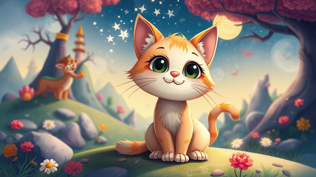 Cute cat illustration for a storybook for kids in the style of Tarsila do Amaral, UHD, HDR, 8K, playful and whimsical appearance, expressive eyes, charming posture, vibrant colors, surrounded by an enchanting landscape, maintaining a dreamlike quality, imaginative scenery with fantastic elements, capturing a sense of wonder and curiosity, maintaining artistic coherence and distinct style, refined details, no visual distractions or distortions, seamless composition, emphasizing the magical and delightful aspects of the scene.