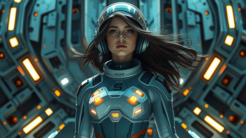 A strikingly beautiful girl in a spacesuit stands against the backdrop of a massive, hyper-detailed, minimalistic sci-fi spaceship, reminiscent of the styles of Tsutomu Nihei and Sidonia no Kishi. Her hair flows dynamically, illuminated by cinematic lighting that casts dramatic shadows. Her spacesuit features glowing elements on the chest, and she wears a sleek helmet. A piercing catches the light, and she dons headphones. The scene is characterized by symmetry and a palette of bright, gold accents, set against striking contrasts. Despite her form-fitting attire, her physique is slender and elegant, offset by the futuristic environment that surrounds her. The spaceship’s surfaces are detailed with rivets and a sense of industrial precision. Bright lights punctuate the scene, creating an almost blinding effect while enhancing the high-definition clarity of this futuristic tableau.