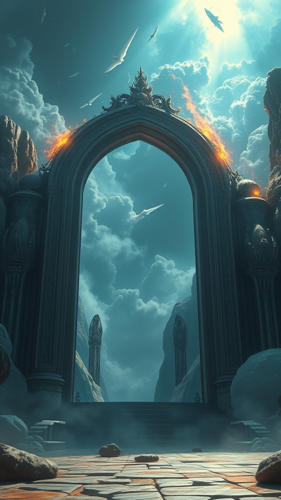 Cinematic depiction of ethereal gates to heaven, intricately detailed, showcasing realistic, atmospheric elements in 8k resolution. Styled with inspiration from Ivan Aivazovsky, Peter Mohrbacher, and Greg Rutkowski, the scene features volumetric light effects with broad lighting. The artwork embodies the essence of oil painting, blending fantasy and sci-fi realism reminiscent of premium prints, as if rendered in Unreal Engine.