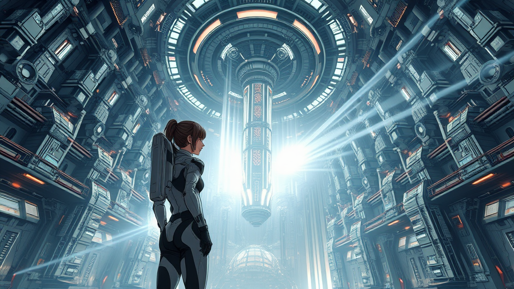 A young woman clad in a sleek, futuristic spacesuit stands within the confines of a colossal spaceship, its interior echoing the intricate and sprawling designs reminiscent of Tsutomu Nihei's style. Inspired by Sidonia no Kishi, the environment showcases elements of gigantism, dominated by towering, multi-story structures. At the heart of this sci-fi marvel lies a massive laser generator, a centerpiece that pulses with energy. Beams of light descend dramatically from the sky, converging into energy clots that shimmer and pulse with acceleration, illuminating the scene with flashes of intense light. The atmosphere is charged with a sense of speed and momentum. The hyper-detailed setting is captured in stunning 8K HD resolution, blending anime drawing aesthetics with the crispness of manga graphics. The perspective is immersive and first-person, drawing the viewer into a meticulously crafted futuristic world.