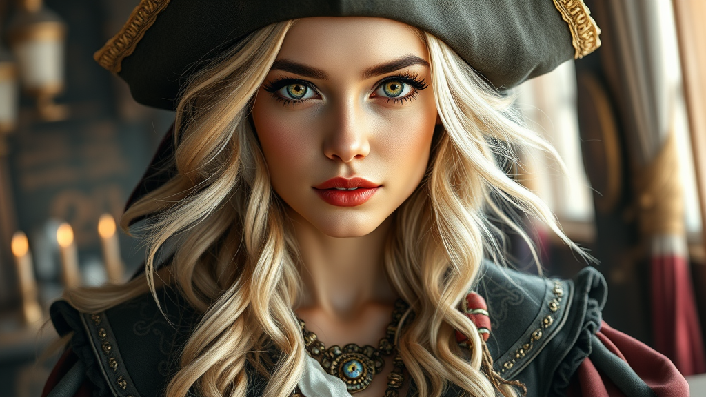 A breathtaking hyper-realistic digital painting of a stunning 20-year-old woman with cascading blonde hair, dressed in elaborate pirate captain attire. Her ensemble is rich in detail, featuring intricate embroidery and a mix of rugged textures, accessorized with ornate jewelry hinting at treasure. Her striking eyes, a captivating blend of random colors, gaze forward with confidence, hinting at adventures untold, as natural light bathes her flawless face in a soft luminance. The portrait captures a full-body view, showcasing her perfect anatomy and the flowing layers of her garments. Her random colored hair falls in luscious waves, adding a sense of wild freedom to her regal posture. The vibrant color palette blends harmoniously with her luminous complexion, utilizing bright yet realistic hues to accentuate the texture of her skin and the fine details of her attire. A complex play of bar lighting casts intriguing shadows that add depth and a gritty realism to the scene. This masterpiece, shot with sharp focus and intense 16K resolution, presents a fantasy vision with award-winning characteristics, balancing vivid coloration with a meticulous attention to detail. Her enchanting eyes mirror the hues of the sea, an element of mystery in their depths, while her expression exudes both elegance and an untamed spirit.