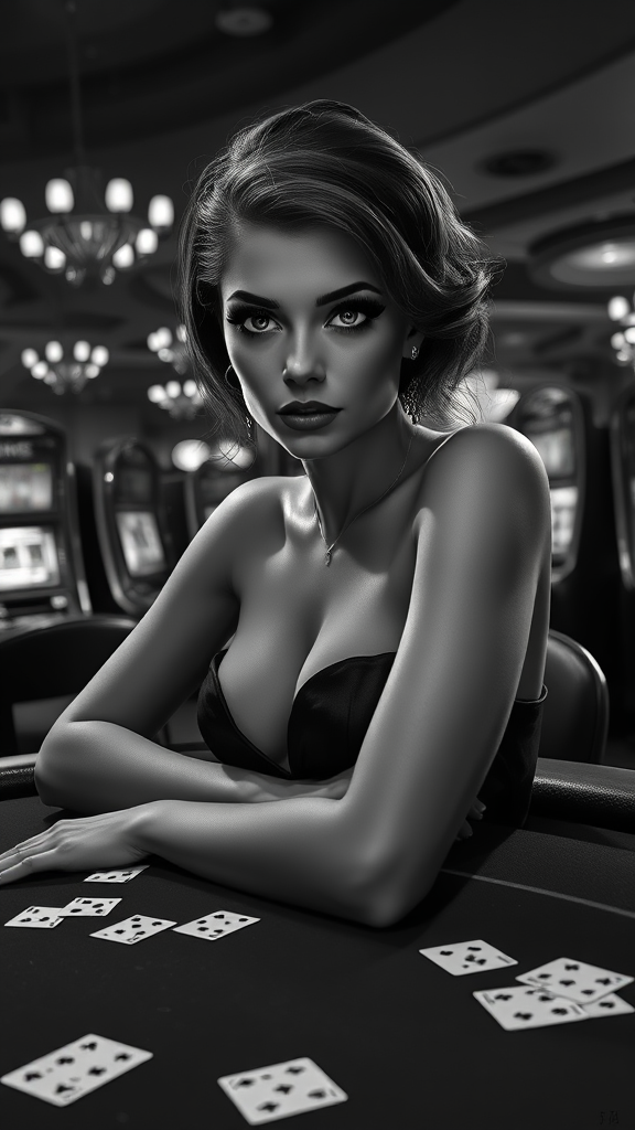 A full-body black and white photo of a stunning woman, exuding the essence of a classic femme fatale as she elegantly sits on a blackjack table. Her eyes, accentuated with mascara, reflect the dim, dramatic lighting, reminiscent of chiaroscuro style. With a delicate nose and a captivating smile, she is surrounded by the bustling ambiance of a Las Vegas casino, with slot machines and playing cards scattered around. The scene is painted in an intricately detailed, impressionistic style, inspired by renowned artists such as Waterhouse, John Constable, and Jeremy Mann. The artwork, a blend of majestic realism and trending digital artistry from platforms like ArtStation and CGSociety, captures her poised elegance and the atmospheric tension of a high-stakes game. Despite surreal elements like tiny playing cards and abstract colors, the composition is balanced and harmonious, devoid of any anomalies like extra limbs or disfigured features, creating a mesmerizing, high-detail masterpiece.