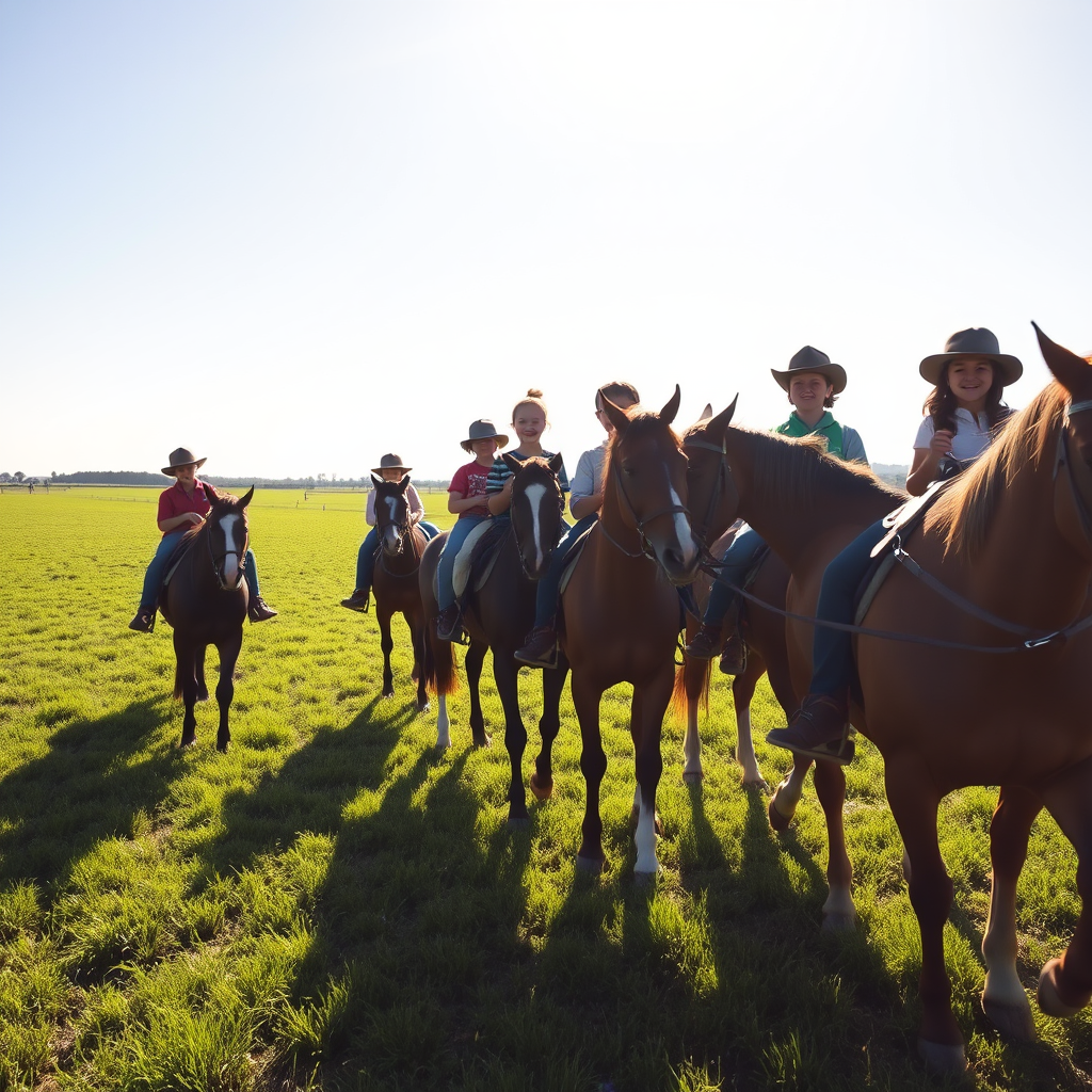 A lively group of students eagerly learning horseback riding on a sprawling green field, scene captured in a still movie frame under the bright, midday sun, with the light casting cheerful shadows, each student paired with a trained horse, surrounded by open skies and a gentle breeze carrying the scent of fresh grass.
